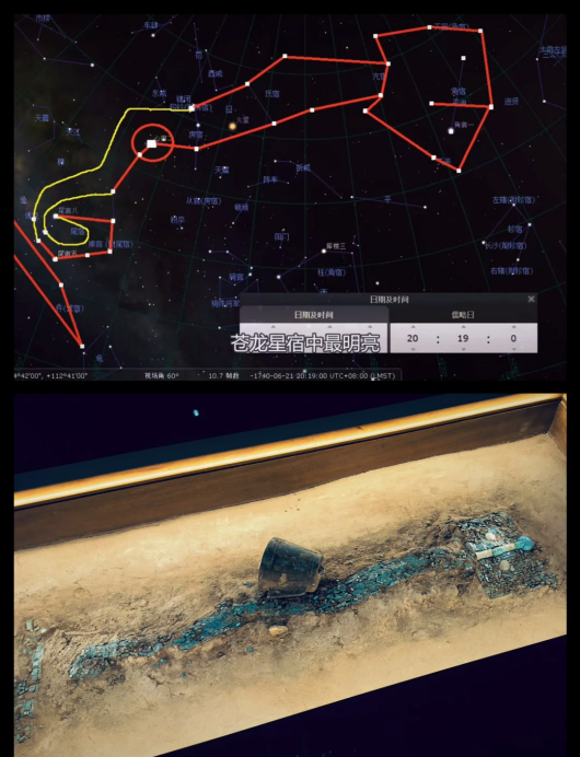 这张图是河南偃师二里头出土的绿松石苍龙和星空图的东方七宿比对,说明早在远古的夏代,中国先民已经拥有成熟的天文知识了。